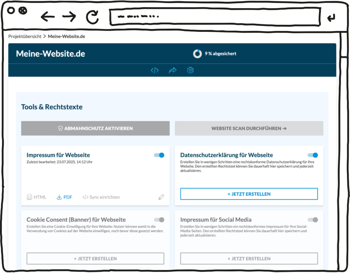 Wichtig ist: Juristisch saubere Rechtstexte sind nur ein Teil der Absicherung. Ergänzende Leistungen wie automatische Updates, eine Cookie-Consent-Lösung, sowie ein Website-Abmahnschutz oder anwaltliche Beratung sorgen für zusätzlichen Schutz.